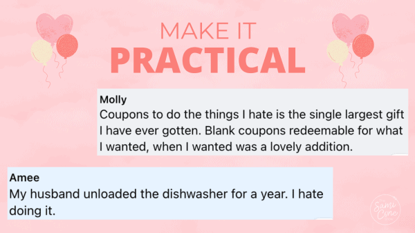 The number one thing you wanted for Valentine’s Day was a practical gesture. Create a coupon for doing something your spouse doesn’t like to do (redeemable whenever they choose). Your suggestions included unloading the dishwasher for a year or even blank coupons redeemable for whatever you want.