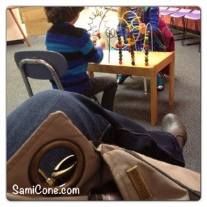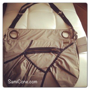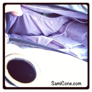 I removed the changing pad it came with and quickly filled it with a lovely assortment of pens, lip gloss, notebooks, my iPhone, frequent shopper cards, hand sanitizer, gum and the like…and I didn’t lose any of it thanks to the specially designed compartments.