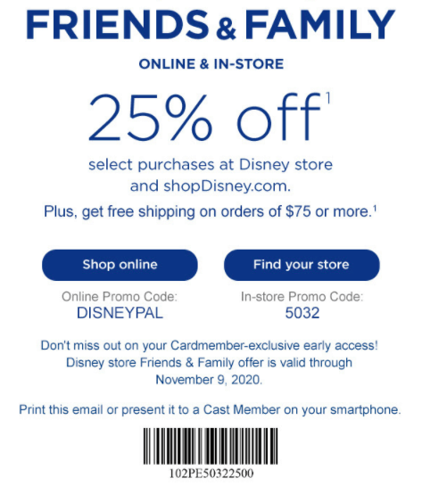 Save up to 25% off during the Disney Store Friends & Family Sale with code DISNEYPAL, plus get free shipping on order of $75+.
