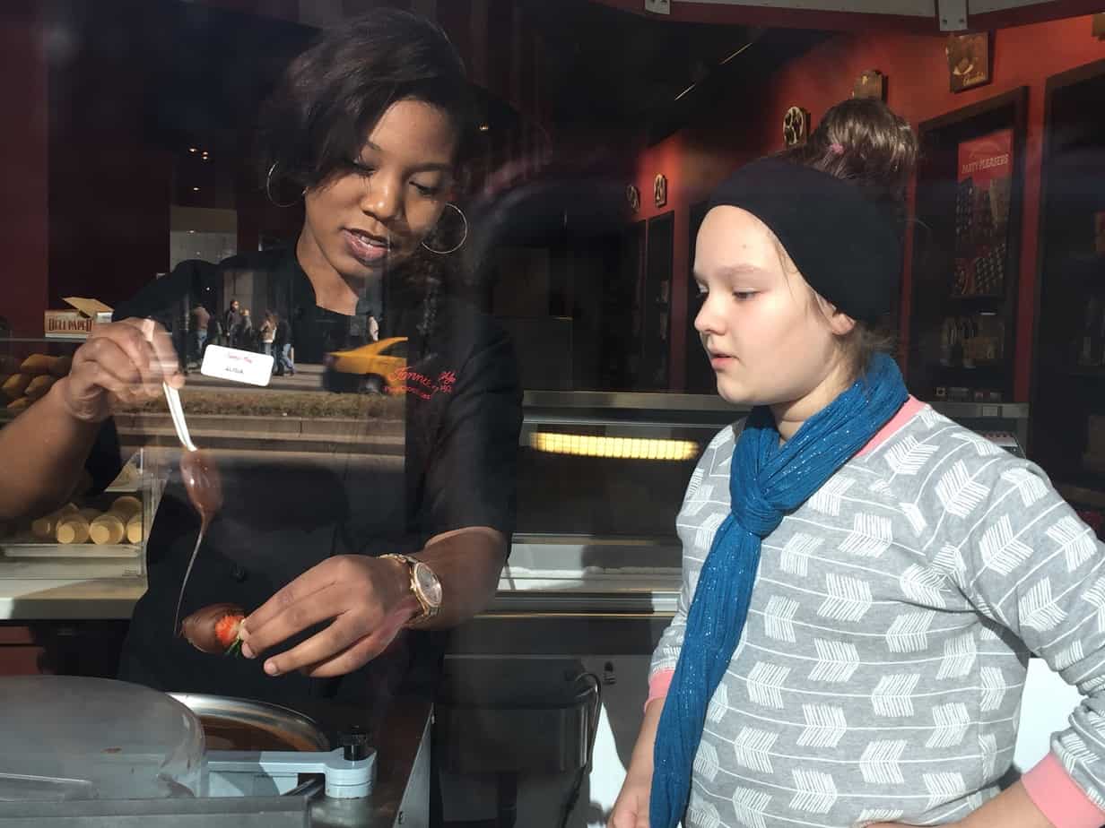 A staple in Chicago for almost a century, we headed across the river on Michigan Avenue to the Fannie May Chocolate shop to not only sample their delicious offerings, but to get a personal lesson in hand-dipping chocolate covered strawberries!
