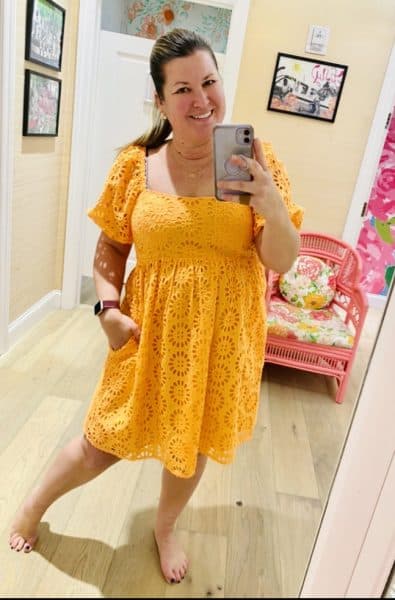 One other note: I’m a pretty true size 14 right now, but I’m wearing a size 12 in this dress. I liked where the bust and hem hit better in the 12. It’s also very forgiving.
