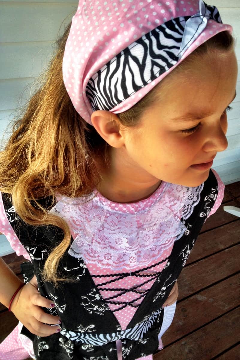 Looking for a homemade girls pirate costume idea? Look at what Grandma sewed for Kariss, complete with matching pirate bandana:
