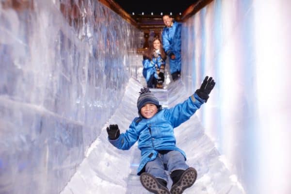 Don’t worry, an ICE experience would not be the same without a trip down the 2-story ICE slide. You’ll find a one-story slide for smaller siders. Or ride your puffy blue coat down a slippery wonderland after climbing two stories of stairs.