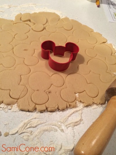 Form into ball on floured surface and divide dough in half. Roll out dough to make it about 1/8 inch and then cut out Mickey heads with your Mickey cookie cutter. Bake cookies on a cookie sheet lined with a silicon baking mat for about 6 minutes…do not over-bake! Once out of the oven, allow the cookies to cool completely on a wire rack before frosting.