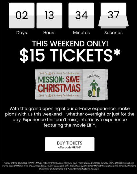 On the Grand Opening day for Mission: Save Christmas featuring Elf™, Opryland celebrated with $15 tickets. They offered 50% off tickets for visits opening weekend only: November 19-21.