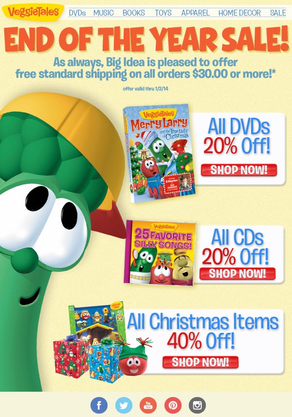 There have been a lot of great VeggieTales deals going on lately, receive free shipping on all orders over $30 and 20% offall DVDs and CDs and 40% off all Christmas items! The sale ends January 2nd and there is no code needed.